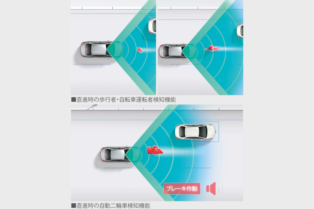低速時の自車直前にいる歩行者、自転車運転者、車両検知機能により衝突回避・被害軽減をサポート。