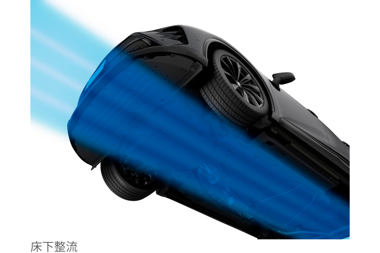 デザインと空力性能を高い次元で融合させたクラウンスポーツ。空力にも寄与するキャビンの造形や、床下流速を高めダウンフォースを発生させるエアロスタビライジングアンダーボディステップなど、接地性・直進安定性を向上させる数々の床下アイテムを設定しています。