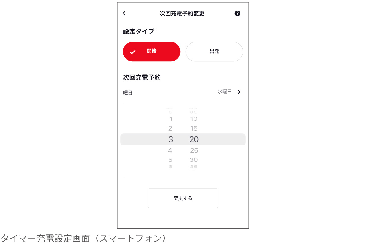 普通充電の開始または出発時刻をあらかじめ設定できる機能です。ディスプレイオーディオ画面やマルチインフォメーションディスプレイから充電の予約が可能。また、スマートフォンアプリ「My TOYOTA+」では、次回予約の変更や、遠隔操作で充電を行うことができます。